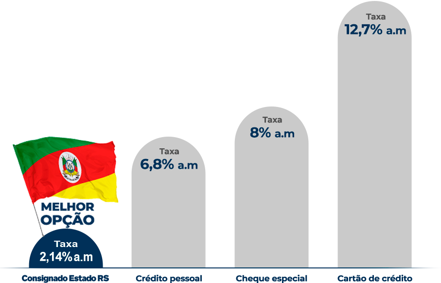 • Por ser descontado diretamente no contracheque do servidor, o Consignado Estado RS possui taxa de juros mais baixas do que outras modalidades de crédito, com taxa de juros a partir de 2,14% ao mês.